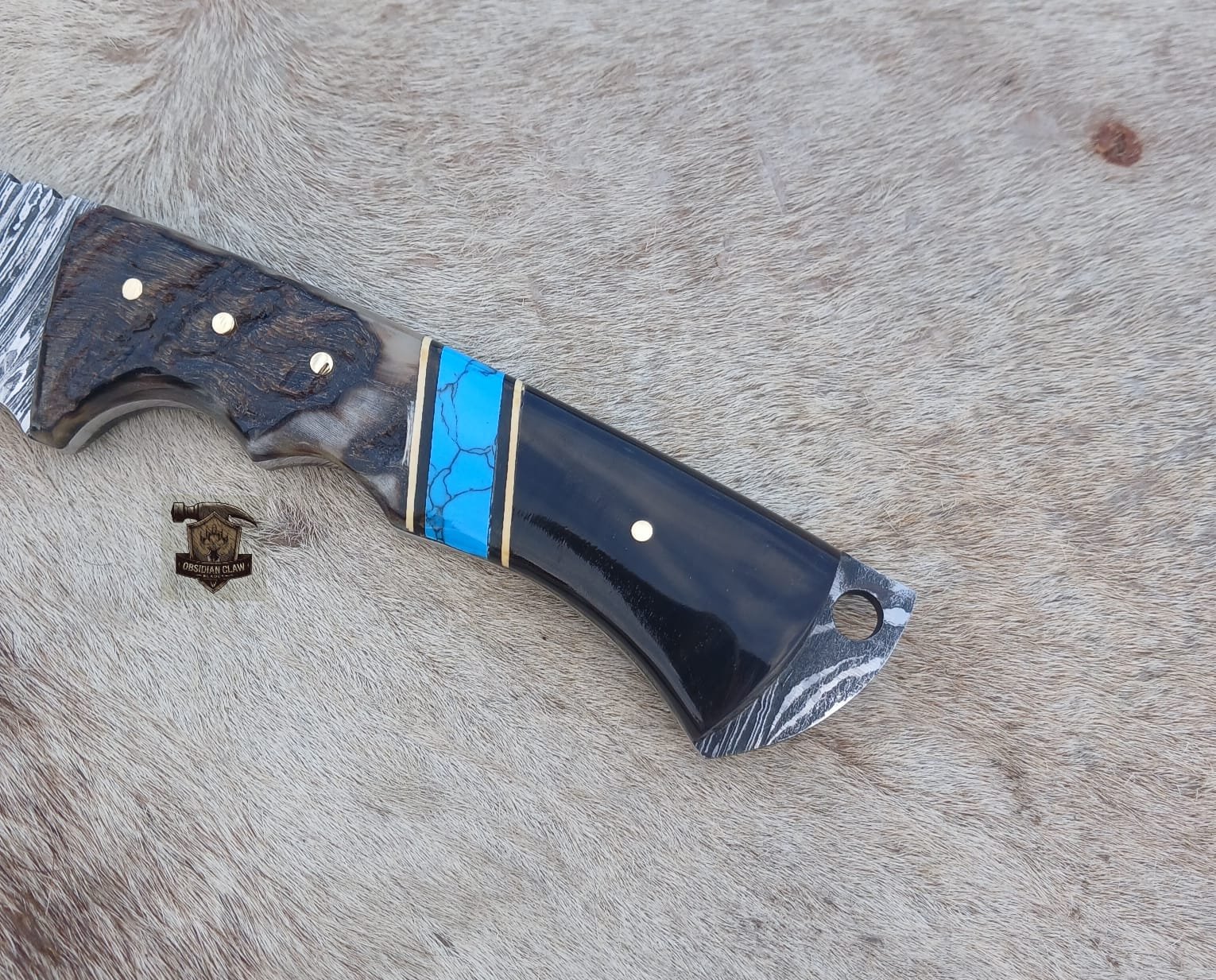 • Handle Material: [Natural RAM horn + Buffalow horn + Blue turquious stone Spacer + brass pins]