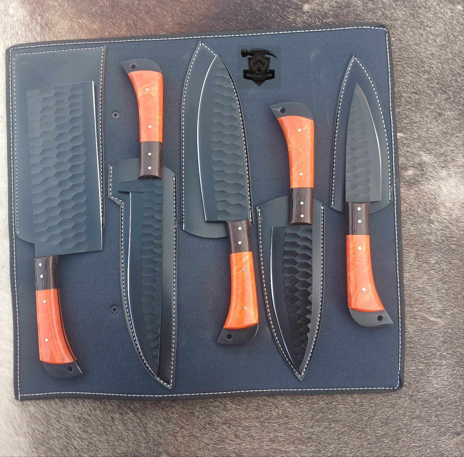 Handmade BBQ 5 pcs black coated kitchen knives set leather rolling bag.