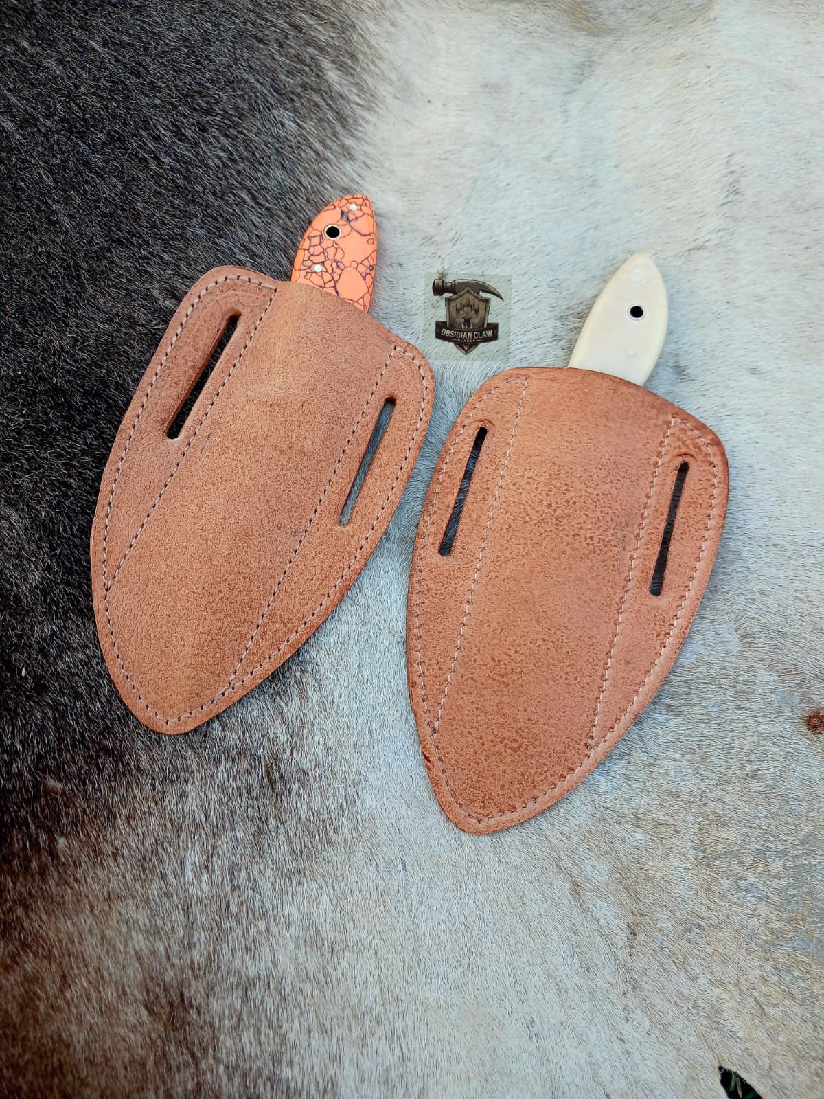 They’re heavier than other standard drop point knives, but since they’re fixed blades the additional weight makes them easier to use as tools. The overall balance is slightly off for my taste, being about a finger width down the grip, but the additional material at the bottom of the blade protects the hand from injury during any potential wet work. The knife maker was able to produce 2 knives with the exact same balance point, which is much harder than it would appear.