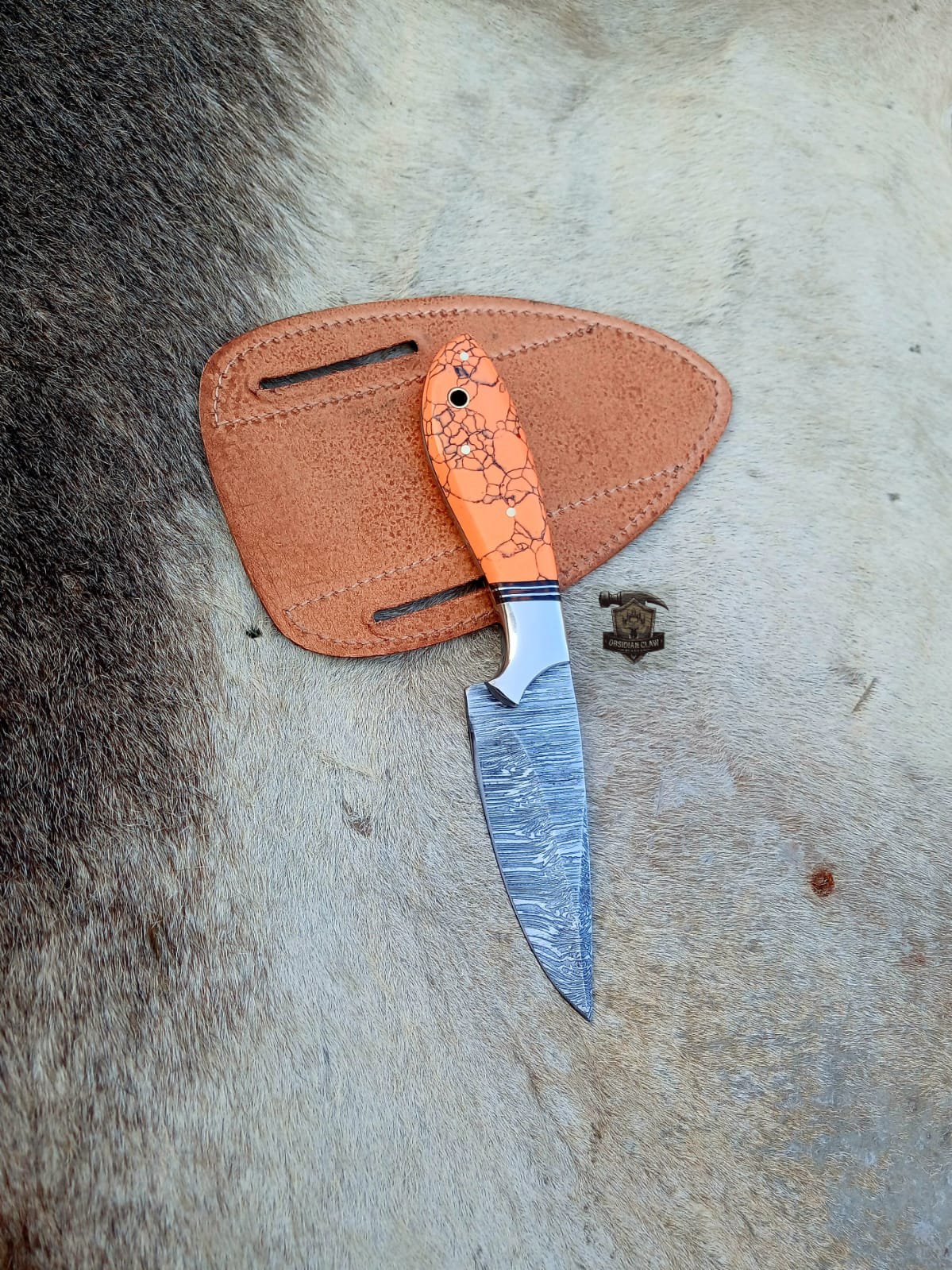 The handle is carefully shaped for a secure and comfortable grip, reducing hand fatigue during extended use. Made from [White bone & Orange stone with steel Bloster], it provides excellent durability and resistance to wear, ensuring a long-lasting and reliable performance in any condition.